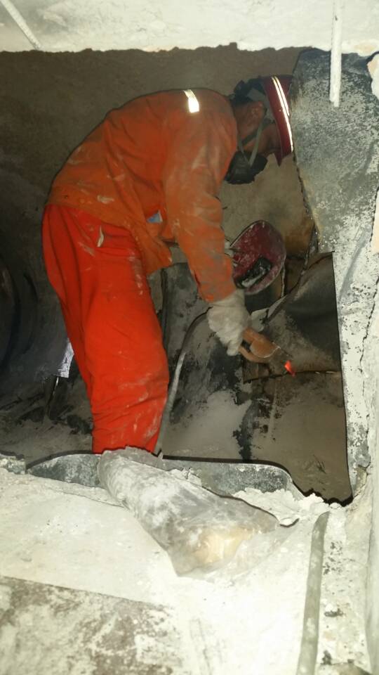 全廠沒有電源,意味著硅業(yè)收塵車間的引風(fēng)機(jī)也停運,清灰工作就要在高溫且無負(fù)壓的條件下進(jìn)行,煙道內(nèi)的溫度達(dá)到70多度,向外噴熱煙塵,加上澆注料的熱輻射,進(jìn)入煙道立刻汗流浹背。此種作業(yè)環(huán)境,在員工心里和生理上都是一項巨大的挑戰(zhàn)。更具挑戰(zhàn)性的是5#鍋爐割除不銹鋼板的工作,煙道內(nèi)的電焊操作人員,需把不銹鋼板割成小于50cm的小塊,然后一塊一塊地從人孔門遞出。在此高溫環(huán)境下作業(yè),每個操作員只能堅持十幾分鐘,輪流上陣。長時間的焊割作業(yè),使每個人的面部都被烤的紅腫,疼痛。面對挑戰(zhàn),中材節(jié)能人沒有退縮,而是爭分奪秒奮勇作戰(zhàn)。換班的間隙,許多員工兄弟們累得背靠背都能入睡。在中材節(jié)能龍陵子公司員工努力下,持續(xù)作戰(zhàn)二十個小時,如期完成檢修,全力保障運營,展現(xiàn)了中材節(jié)能人的責(zé)任、力量與風(fēng)采。